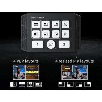 Thiết bị hỗ trợ hiệu ứng PIP và PBP, giúp người dùng dễ dàng chuyển đổi giữa hai nguồn phát khác nhau chỉ bằng một nút gạt. Với bốn chế độ PBP và bốn bố cục PIP có thể thu phóng, GoStream M2 đáp ứng linh hoạt nhu cầu phát sóng trực tiếp và hội nghị truyền hình.